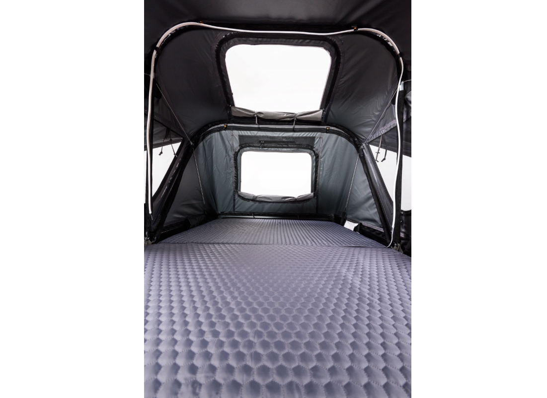 Namiot dachowy ROOF SPACE 4 jest standardowo wyposażony w bardzo wygodny materac z pianki TPU o grubości 5 cm i siatkę antykondensacyjną o grubości 1 cm w pikowanym pokrowcu, który można prać. Takie rozwiązanie daje gwarancję doskonałego snu.